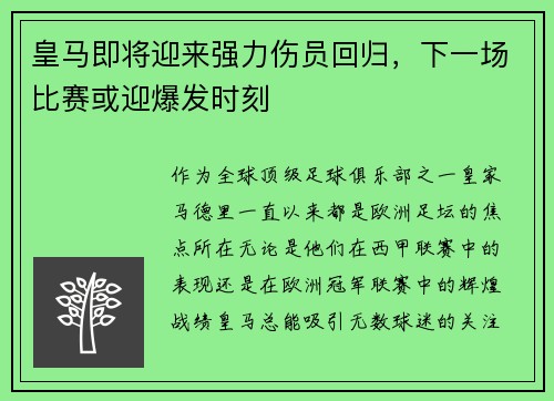 皇马即将迎来伤员回归的好消息,这无疑让球队的未来充满了希望。对于所有皇马的支持者来说,这不仅是一个振奋人心的消息,更是他们期待已久的转折点。随着这些球员的回归,皇马将在接下来的比赛中展现出更加强大的战斗力,向着他们的目标继续前进。球迷们,请准备好迎接皇马的全新爆发时刻吧!