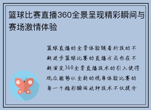 随着科技的不断进步,篮球比赛的直播方式也在不断演变。360全景直播技术的引入,使得观众能够以全新的视角体验比赛的每一个精彩瞬间。这种技术不仅提升了观众的观看体验,也为赛事的传播和推广开辟了新的途径。本文将从多个方面探讨篮球比赛直播360全景呈现的精彩瞬间与赛场激情体验,分析其对观众、球员和赛事本身的深远影响。